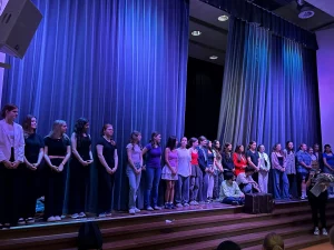Von der Ursprungsidee über die Ausarbeitung des Textheftes bis hin zur konkreten Umsetzung auf der Bühne lag alles in der Hand des Kurses. Das Ergebnis konnte sich sehen lassen. Voller Spielfreude hauchten die Schülerinnen und Schülern ihren Figuren Leben ein. Lilli Vollmer und Amelie Summer überzeugten als ewig streitendes Ehepaar ebenso wie Amy Knöpke als ungehörte Prophetin oder Ceylin Kuyuldar in ihrer Rolle als Obdachlose. Besonders hervorzuheben ist die Teamleistung der jungen Schauspielenden, die den Abend souverän bis zur Abmoderation gestalteten und das Publikum begeisterte.