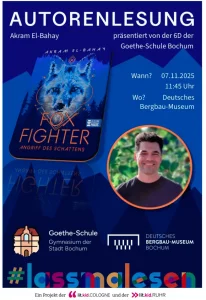 Im Rahmen des Projekts #Lassmalesen der lit.COLOGNE und lit.RUHR begab sich die Klasse 6d auf eine spannende literarische Reise. Ziel war es, ein Buch auszuwählen, eine öffentliche Lesung zu organisieren und diese gemeinsam auf die Bühne zu bringen. Zu Beginn des Projekts lasen die Schülerinnen und Schüler verschiedene Bücher aus einer vorgegebenen Liste und stellten ihre Favoriten in der Klasse vor. Nach intensiven Diskussionen fiel die Wahl schließlich auf den Roman „Foxfighter“ von Akram El Bahay.