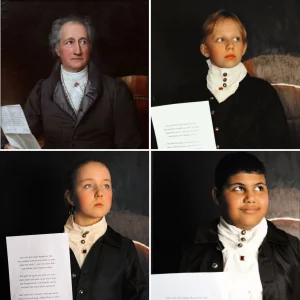 In der Foto-AG haben wir ein bekanntes Goethe‑Portrait nachgestellt. Wir trugen Kleidung wie Goethe, imitierten seinen Gesichtsausdruck und hielten ein Schriftstück mit einem von uns selbst geprompteten, modernen Gedicht im Stil von Goethe.